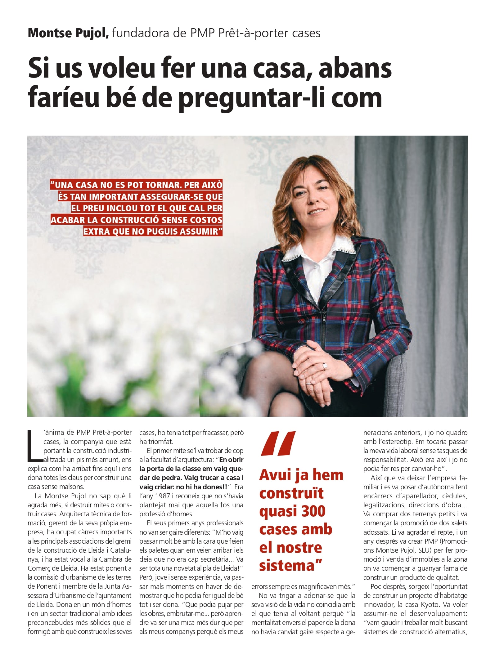 “Si us voleu fer una casa, abans farieu bé de preguntar-li com”, així resumeix el magazín “Casa & Confort” del diari Segre en l’última edició de novembre. La revista ofereix una extensa entrevista a Montse Pujol, fundadora de PMP Prêt-à-porter cases, per parlar dels orígens de l’empresa, els reptes que s’ha trobat com a dona en un sector on predominen els homes i les seves recomanacions a l’hora de comprar-se una casa. A continuació us deixem un resum dels aspectes més destacats, així com les imatges del reportatge.