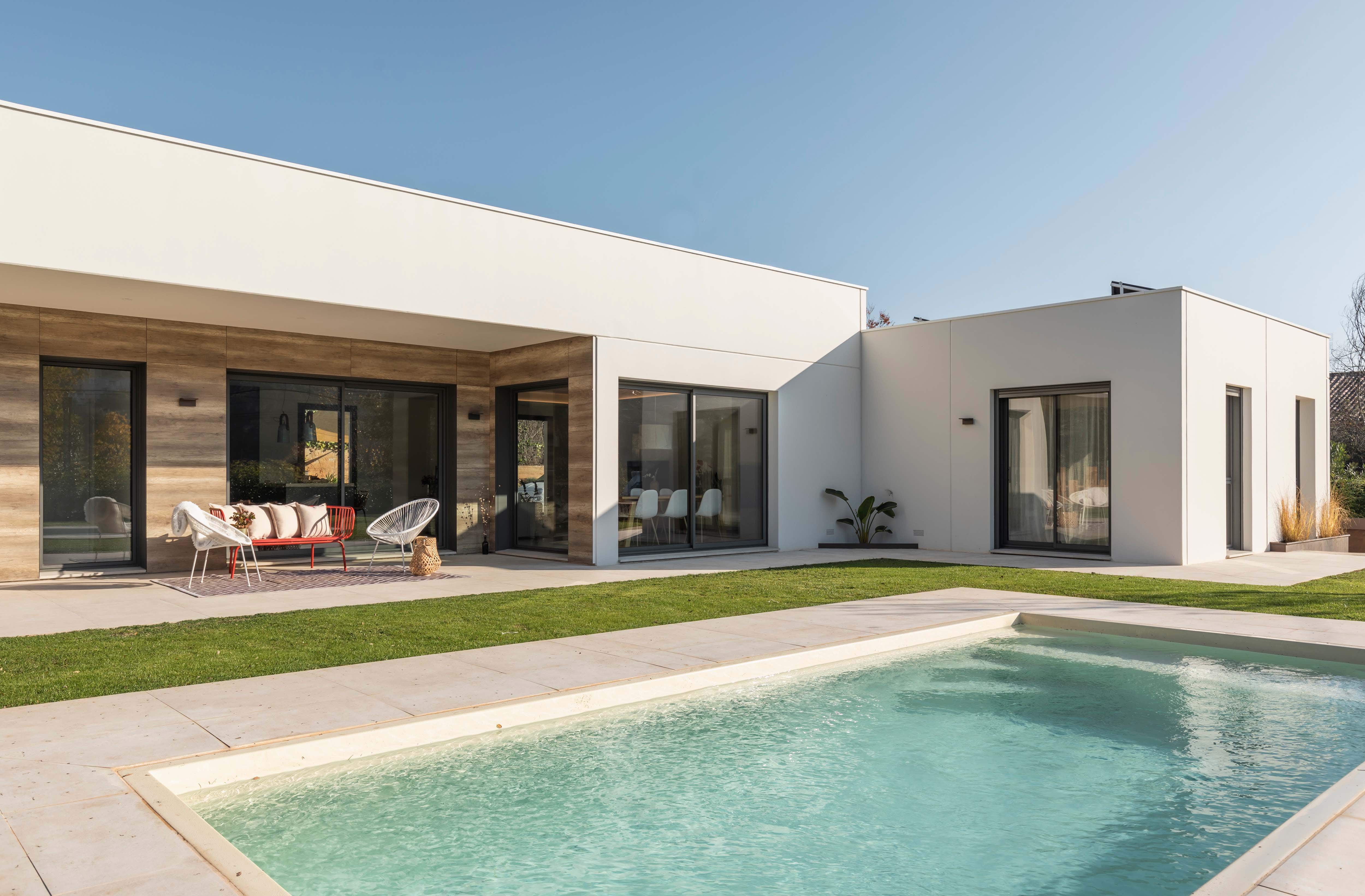 La Olímpia cuenta con un espacioso jardín y una piscina acompañada de un cuidado entorno verde en la parte frontal de la casa. La calidez de este hogar arropa de dentro a fuera gracias a los colores cálidos tanto en su interiorismo como exterior. El pavimento beige, el aplacado en madera y el tipo de vegetación estilo mediterráneo ofrece un ambiente cálido y familiar.
