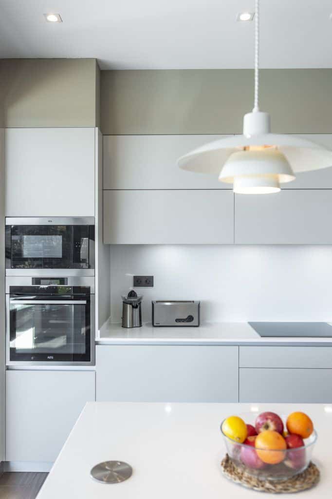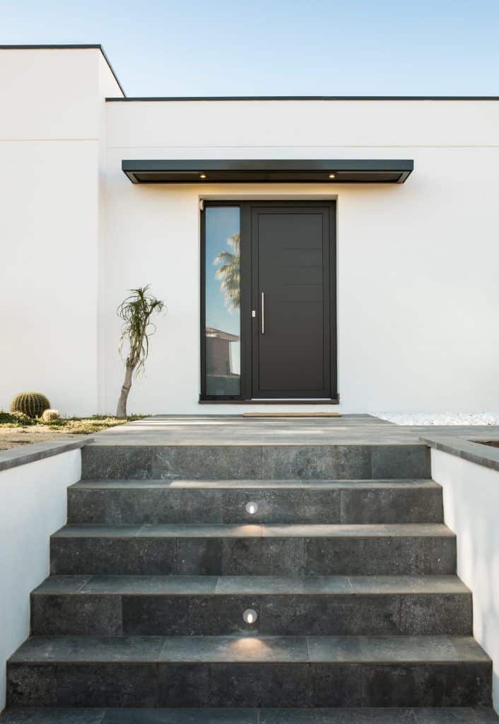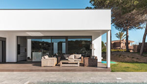 Para conseguirlo, se optó por un diseño en forma de “L” y tonos blancos para las fachadas exteriores, consiguiendo, de esa forma, un fuerte contraste con las perfilerías en color oscuro. En la parte sur-este de la casa se integraba la cocina, el salón y el comedor, optimizando el espacio para generar una visión de amplitud y conseguir la máxima entrada de sol y luz natural.