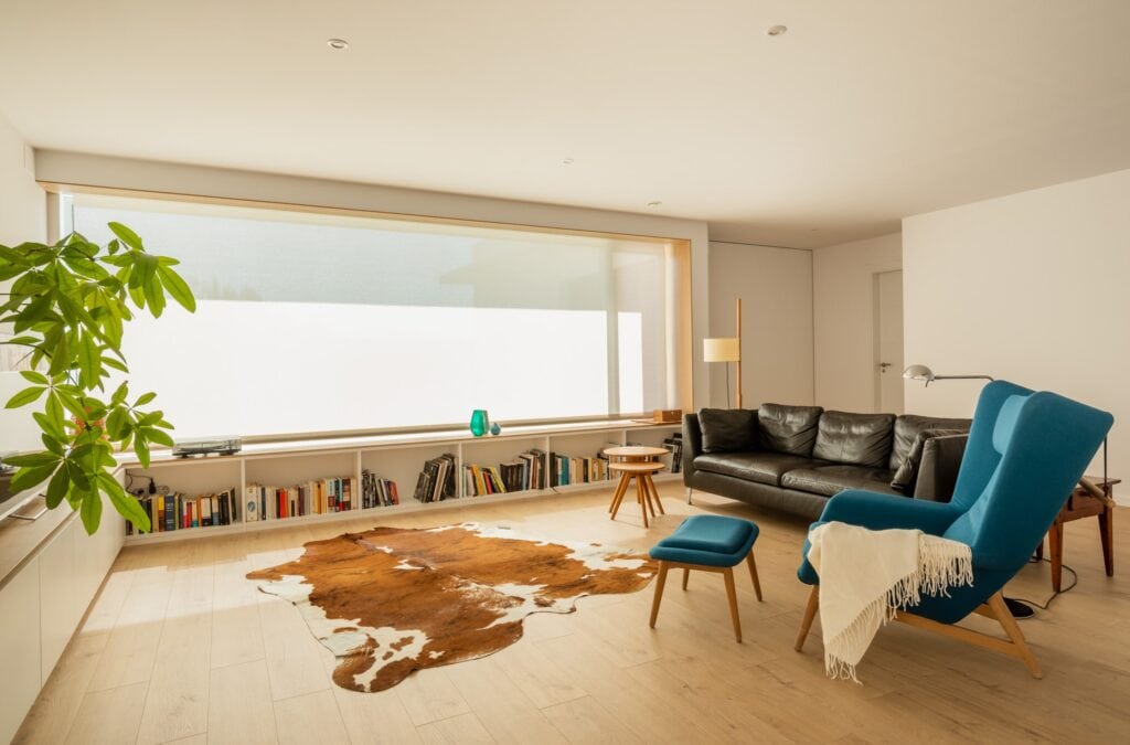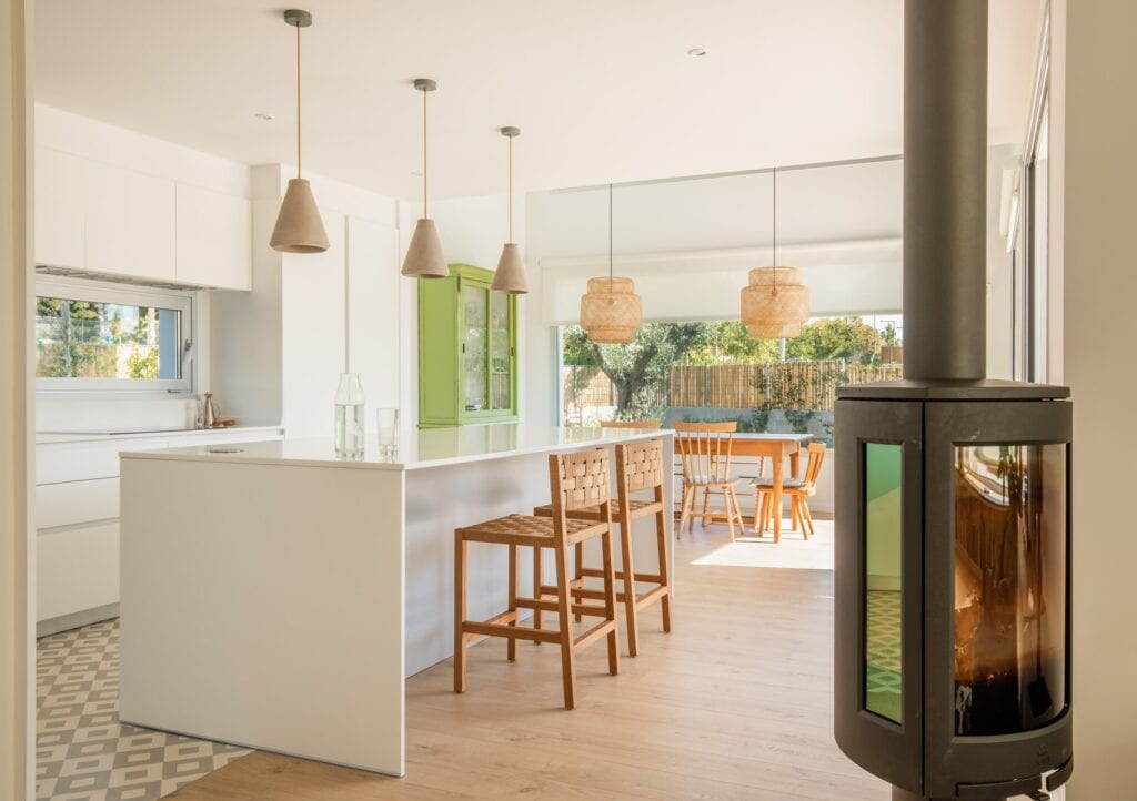 La gran estancia diáfana que une la sala de estar y la cocina está rodeada por un espacio a doble altura y representa el corazón de la casa, donde no faltan la luz natural ni el mobiliario de diseño. Cabe destacar el detalle de la estufa, un elemento que aporta calidez y carácter a la vivienda.