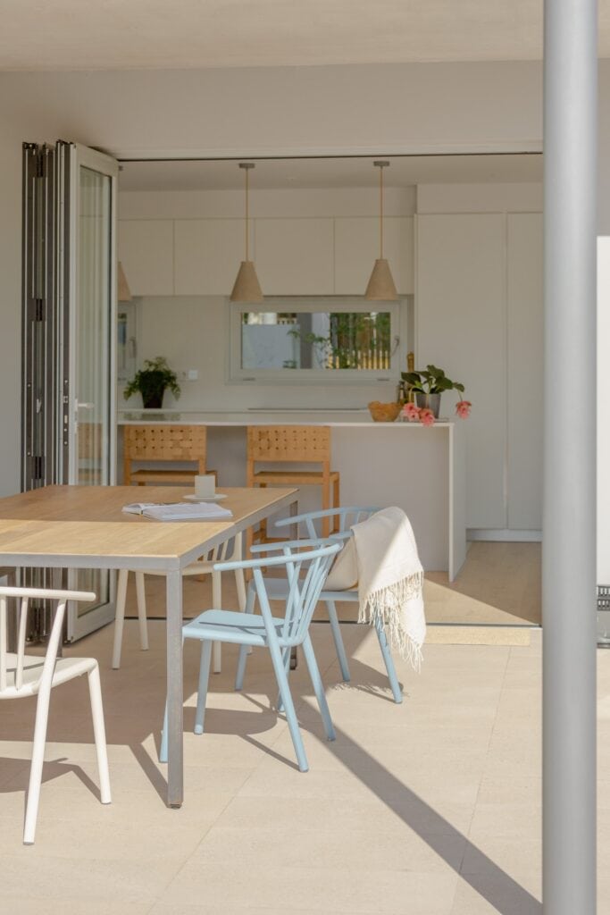 Los diferentes espacios fluyen entre muebles con toques de color y grandes ventanales que conectan directamente con el exterior.