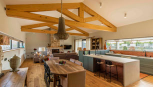 El hogar consta de una planta baja en forma de L en la que se puede distinguir la parte de noche de la parte de día. Primera parada: salón-comedor y cocina abierta, rural, vintage y chic. A primera vista impacta un techo alto con un gran travesaño que va de punta a punta. Una chimenea aplacada en piedra, ideal para disfrutar del calor del fuego en pleno invierno y detalles en madera con tejidos cálidos (sofás, butacas, cortinas y alfombra) en sintonía que aportan calidez y sensación de refugio.
