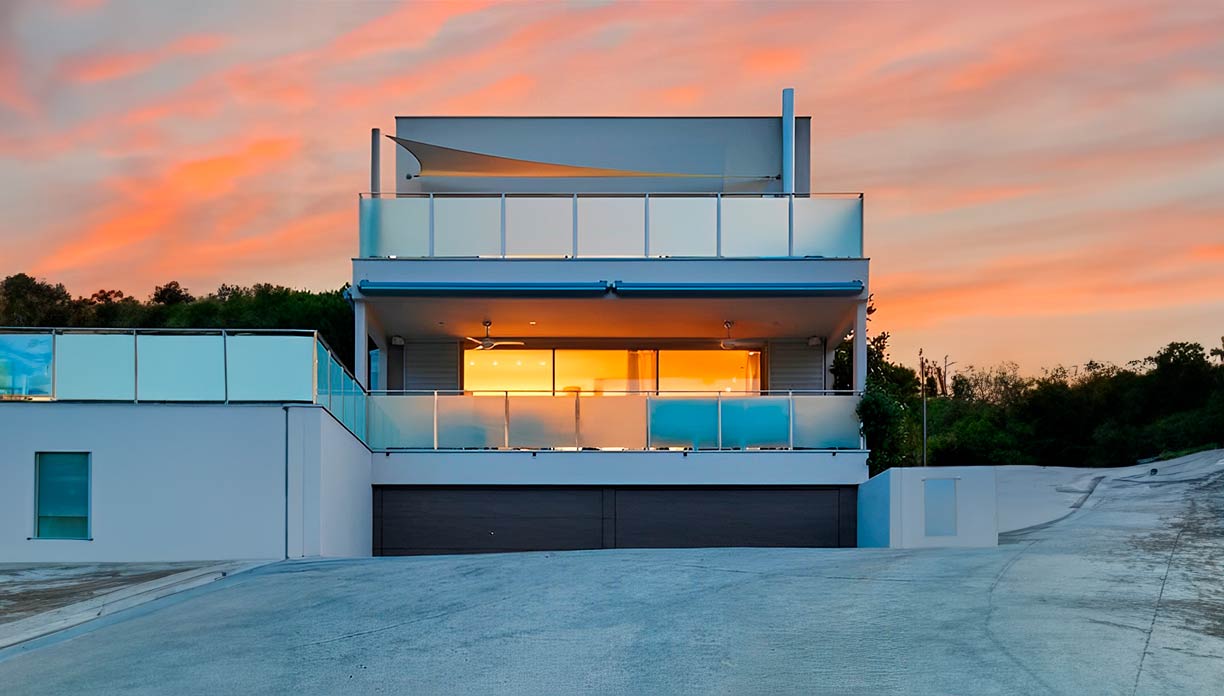 Por la noche, la blancura innata de la Duna Blanca contrasta con la iluminación ténue de los espacios interiores y la piscina, ofreciendo un efecto único que pone en valor la arquitectura de la casa.