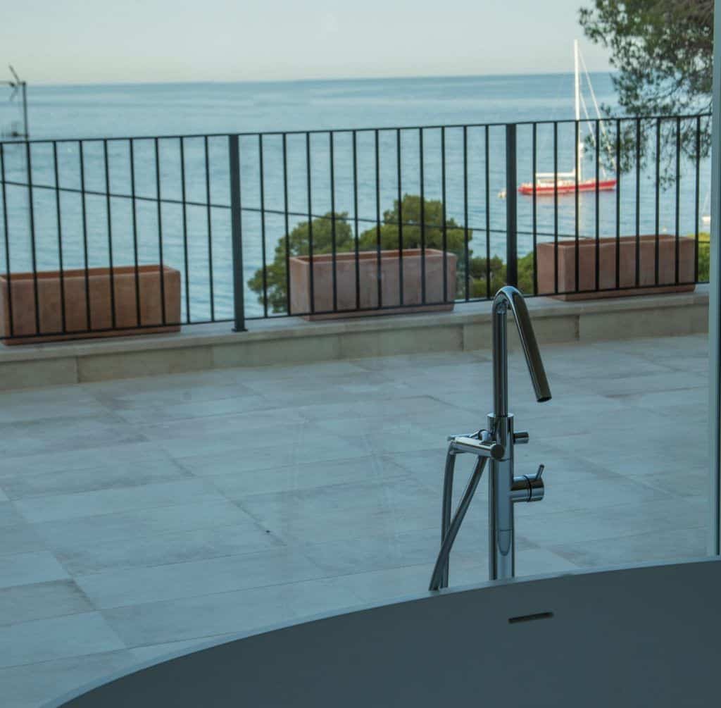 La cocina se abre hacia un espacio diáfano rectangular, completamente de cara al mar. A su vez, los baños destacan por una estética minimalista y una bañera de diseño con luz natural.