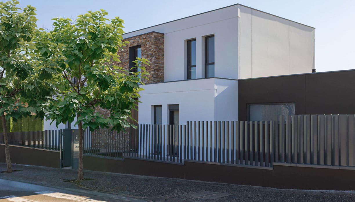 También, lo que la hace de la Can Olivera una casa elegante y sofisticada es su fachada frontal revestida en piedra natural con degradación de color del propio material y la entrada aplacada en madera. Un contraste perfecto de materiales. Asimismo, se sigue una línea cromática donde el protagonista es el beige-marrón. Lo vemos también en el garaje, diferenciado del resto de la casa con una tonalidad marrón.
