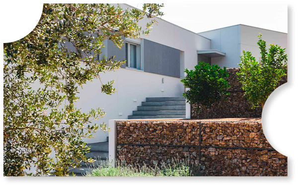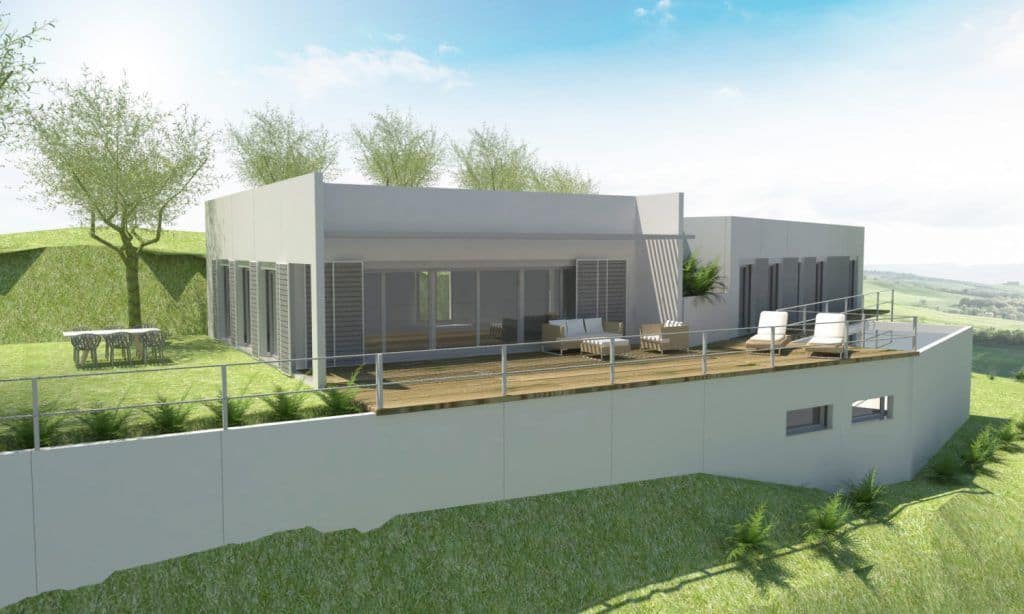 En la voluntad de respetar la ubicación de la piscina, el emplazamiento más privilegiado de la casa, se ha proyectado la entrada al hogar por la parte posterior. Asimismo, se ha requerido la construcción de muros de contención.