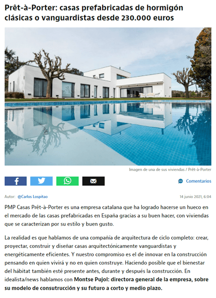 Idealista, la plataforma inmobiliaria líder en España, entrevista a Montse Pujol para conocer todos los detalles acerca de la arquitectura de ciclo completo de Prêt-à-Porter casas y el futuro de la compañía a corto y medio plazo.